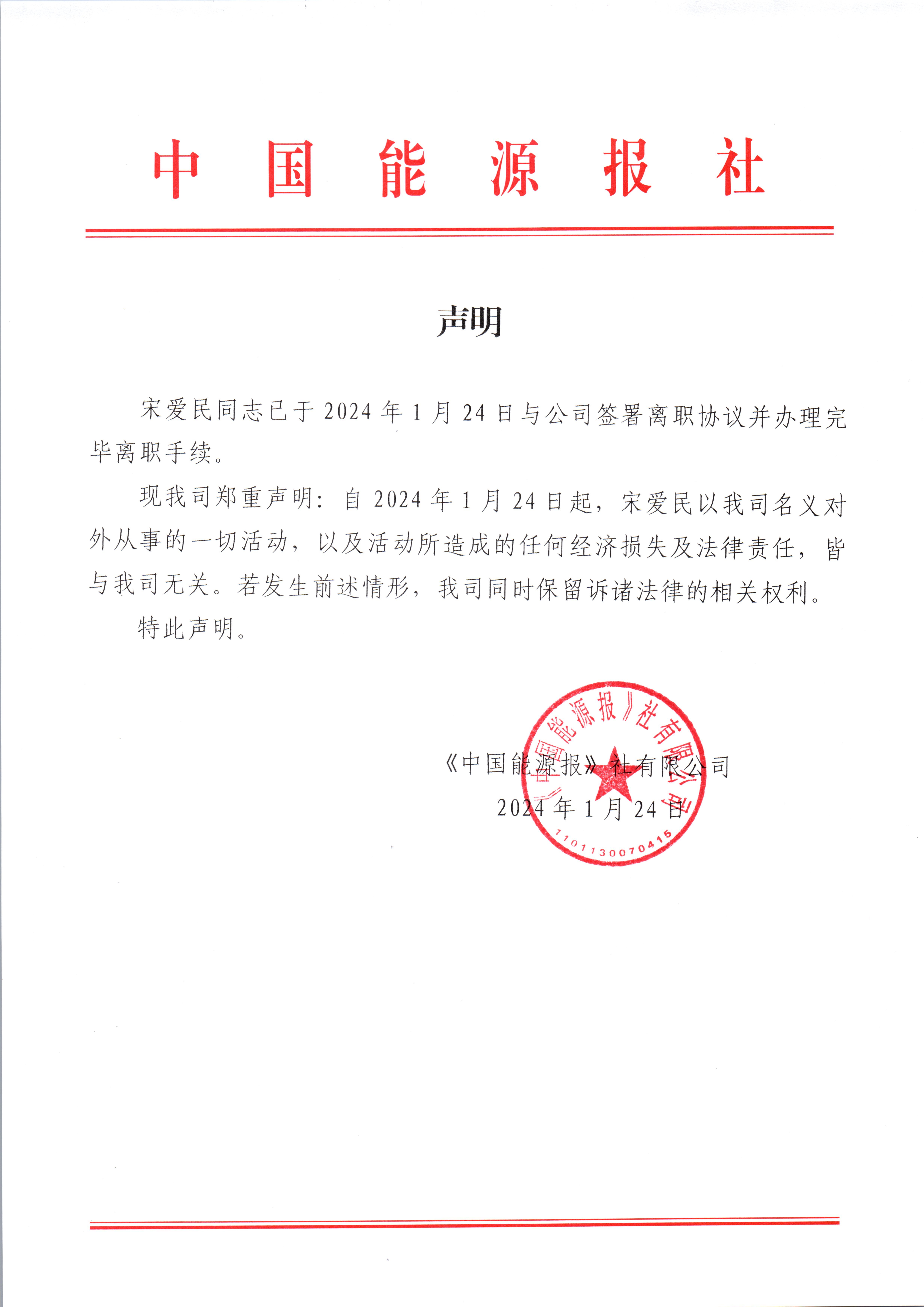 【声明】中国能源报社关于宋爱民同志的离职声明