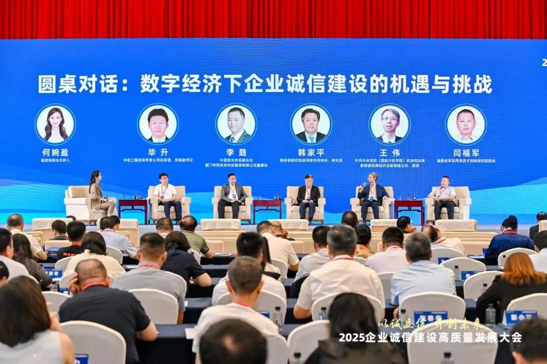 在圆桌对话环节,毕升、李韪、韩家平、王伟、闫福军五位嘉宾,围绕“数字经济下企业诚信建设的机遇与挑战”这一主题进行了深入交流。嘉宾们一致认为,数字化正深刻重塑企业诚信体系,要加快构建可信数据空间、完善算法治理、推动跨境信用互认、强化军民融合诚信机制,形成政府、企业、行业、社会协同共治的新格局。