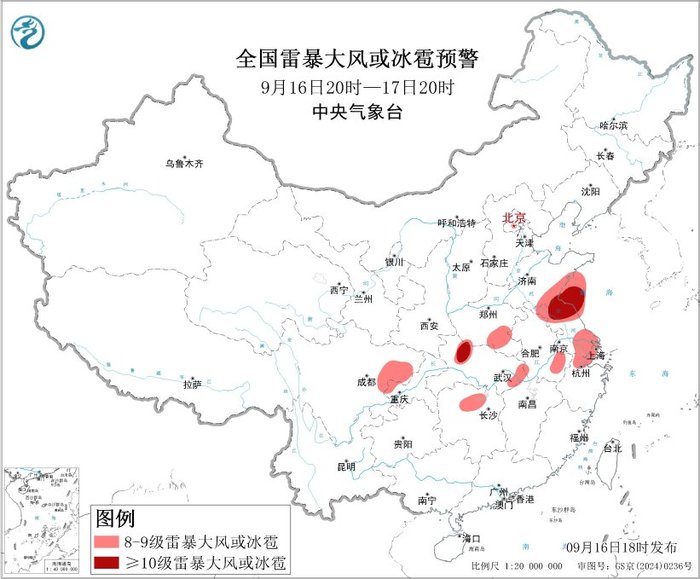 预计9月16日20时至17日20时,黄淮南部、江淮、江汉、江南北部、四川盆地东部等地的部分地区将有8级以上雷暴大风或冰雹天气,其中,江苏北部、湖北西北部等地的部分地区将有10级以上雷暴大风;黄淮南部、江淮、江汉、四川盆地、江南北部、华南南部等地的部分地区将有小时雨量大于20毫米的短时强降水天气,其中,山东中东部和南部、安徽北部、江苏中北部、四川东部、重庆西部、广东西南部、海南岛等地的部分地区小时雨量大于50毫米,最大可达70毫米以上。
