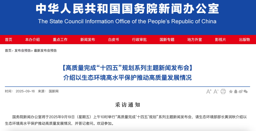9月19日(星期五)上午10时,举行“高质量完成‘十四五’规划”系列主题新闻发布会,请生态环境部部长黄润秋介绍以生态环境高水平保护推动高质量发展情况,并答记者问。