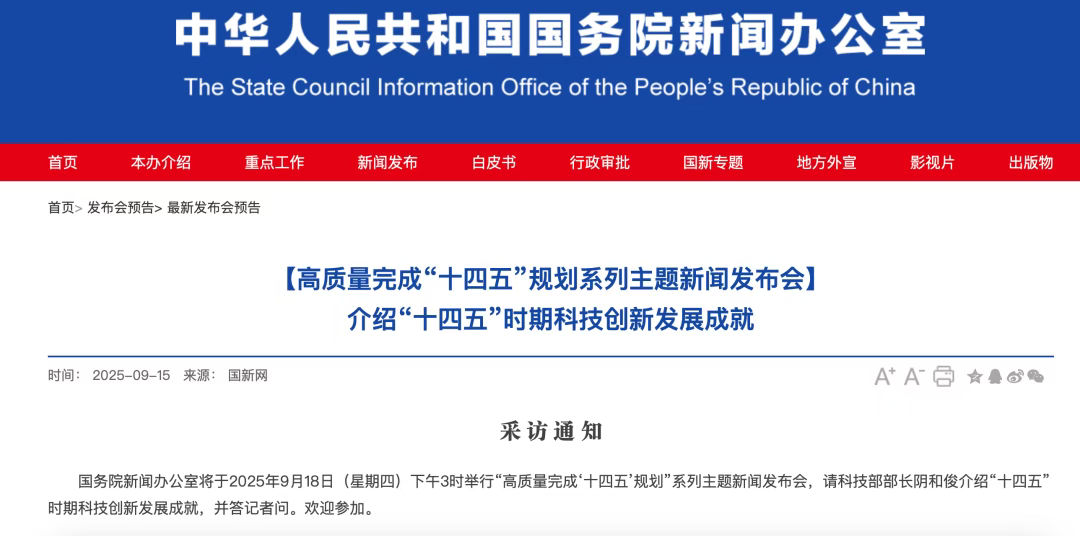 9月18日(星期四)下午3时,举行“高质量完成‘十四五’规划”系列主题新闻发布会,请科技部部长阴和俊介绍“十四五”时期科技创新发展成就,并答记者问。