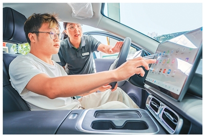 9月11日,在江苏省南通市海安经济技术开发区一家汽车销售门店内,工作人员为消费者介绍汽车各项功能。
