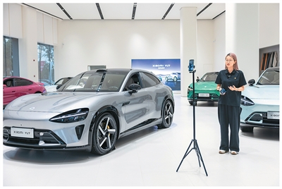 9月9日,在浙江省湖州市东部汽车城产业园,车企工作人员在进行直播宣传。