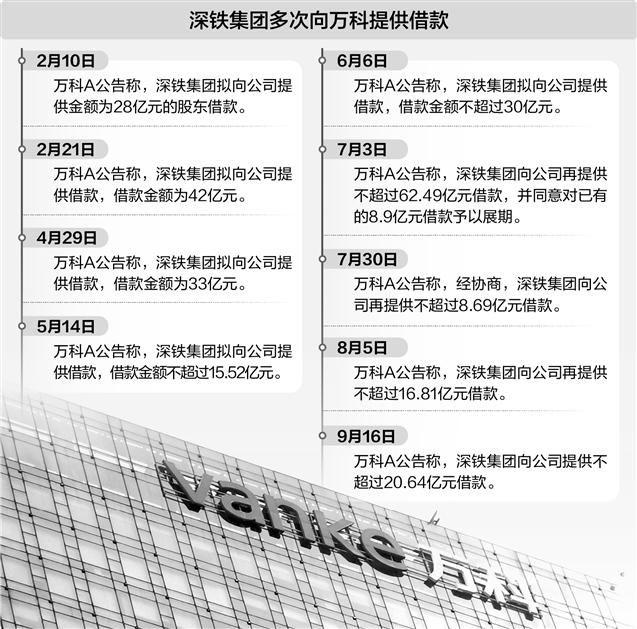 9月16日晚间,万科A(000002)披露公告,深铁集团再次向公司提供不超过20.64亿元借款,用于偿还公司在公开市场发行的债券本金与利息。至此深铁集团已累计向万科提供借款259.41亿元。