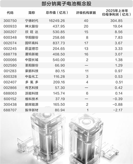 据数据宝统计,上半年归母净利润规模在1亿元以上的钠离子电池概念股共计9股。宁德时代、神火股份、欣旺达、华阳股份排名前四,依次为304.85亿元、19.04亿元、8.56亿元、7.83亿元;国轩高科、蔚蓝锂芯和厦钨新能随后,均在3亿元以上。