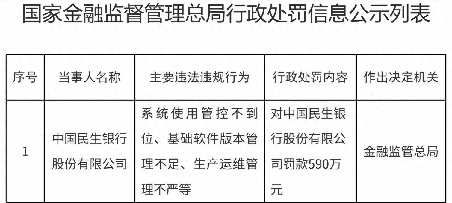 9月12日,国家金融监督管理总局行政处罚信息公示列表显示,中国民生银行股份有限公司(下简称“民生银行”)因系统使用管控不到位、基础软件版本管理不足、生产运维管理不严等,被罚款590万元。