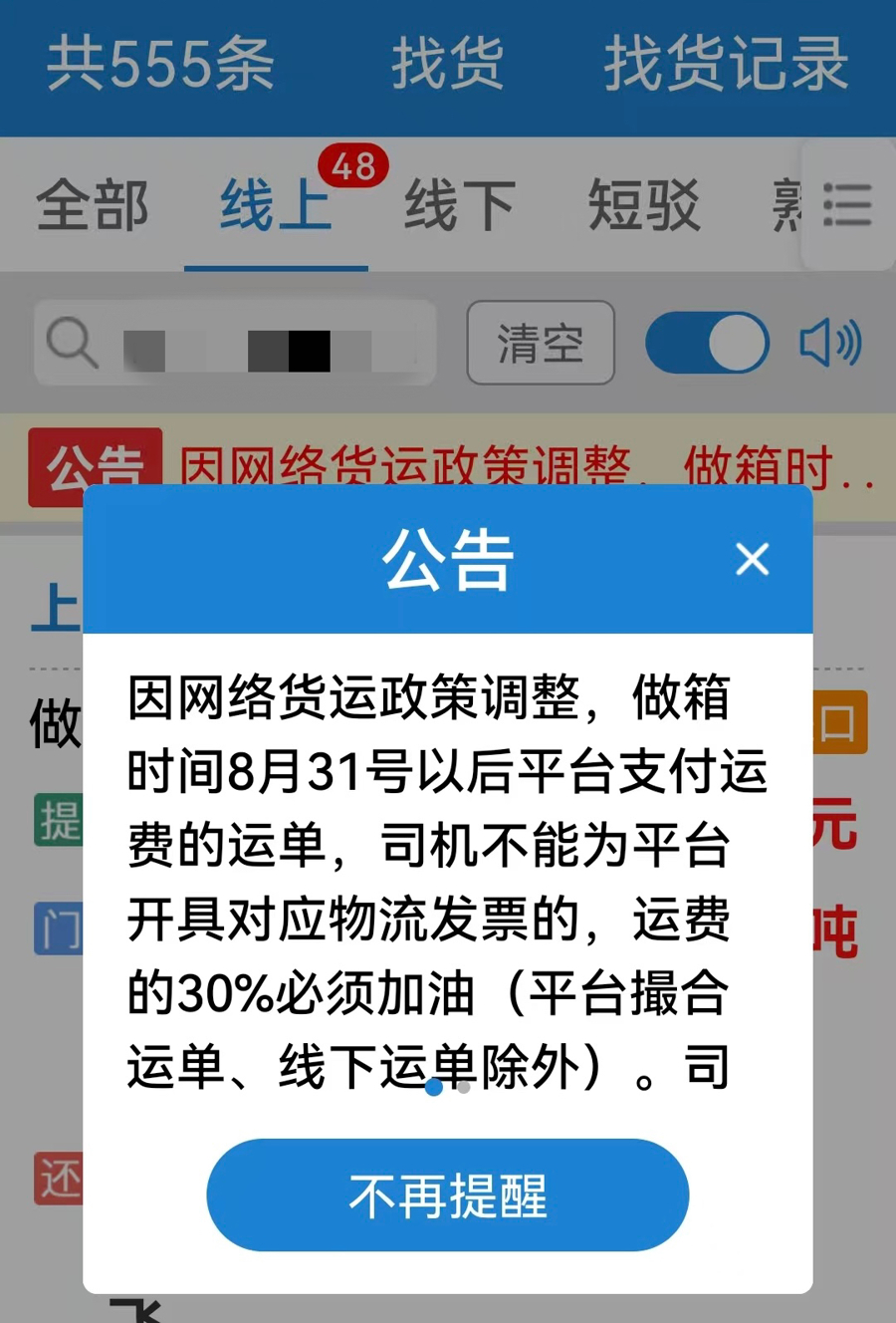 如今打开“一拼通”平台,一条8月30日下午平台发送的弹窗信息显示:“因货运政策调整,做箱时间8月31号以后平台支付运费的订单,司机不能为平台开具对应物流发票的,运费的30%必须加油(平台撮合订单、线下运单除外)。”