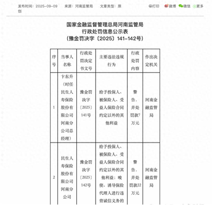 据国家金融监督管理总局河南监管分局9月9日披露的行政处罚信息公示,民生人寿河南分公司及涉事相关负责人已被作出处罚决定。
