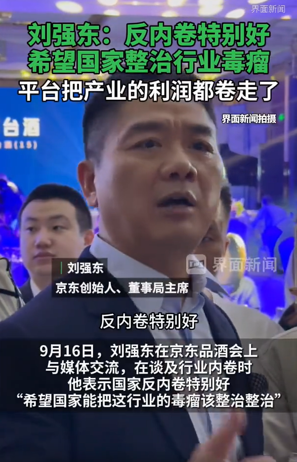 9月16日,刘强东在京东品酒会上与媒体交流,在谈及行业内卷时,他表示国家反内卷非常对,“希望国家能把这行业的毒瘤该整治整治”。 刘强东表示,希望通过外卖的创新和产品的创新,能够真正解决从业者、消费者、平台的利益分配。“本质是,现在平台是把产业的利润全卷走了,这不对。”