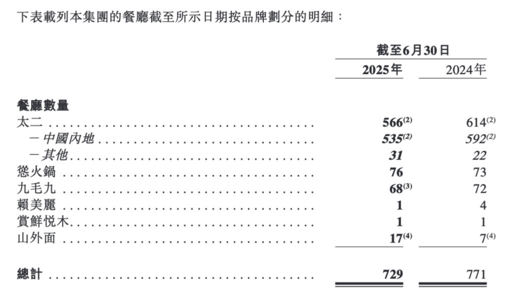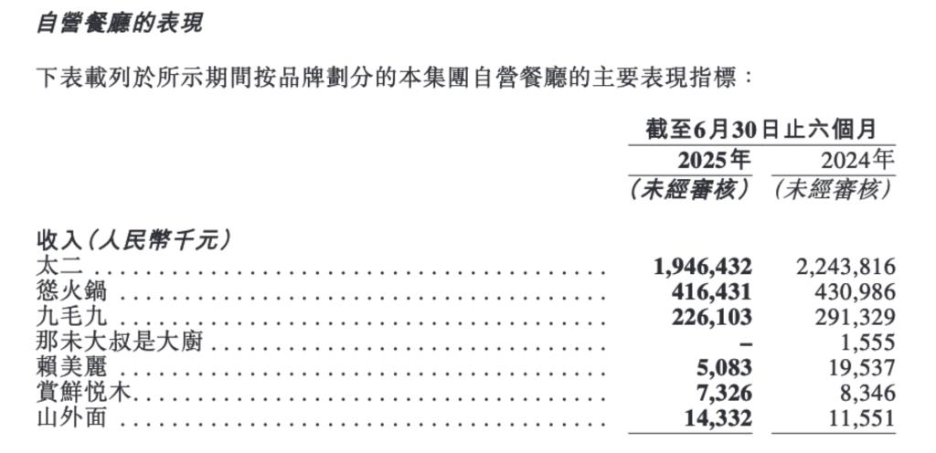 财报还指出,太二收入下滑主要由于太二自营餐厅的数量和同店销售减少,来自太二的收入占总收入的比例从去年上半年的73.4%下降至今年上半年的70.8%。财报还指出,上半年太二、怂火锅及九毛九的翻座率及翻台率于2025年上半年有所减少,主要由于严峻的外部环境令客流量减少。