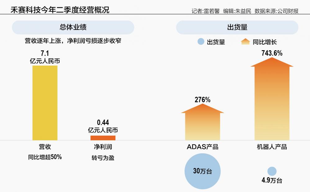 今年二季度,禾赛实现营收7.1亿元人民币,同比增超50%,净利润0.44亿元人民币,转亏为盈。