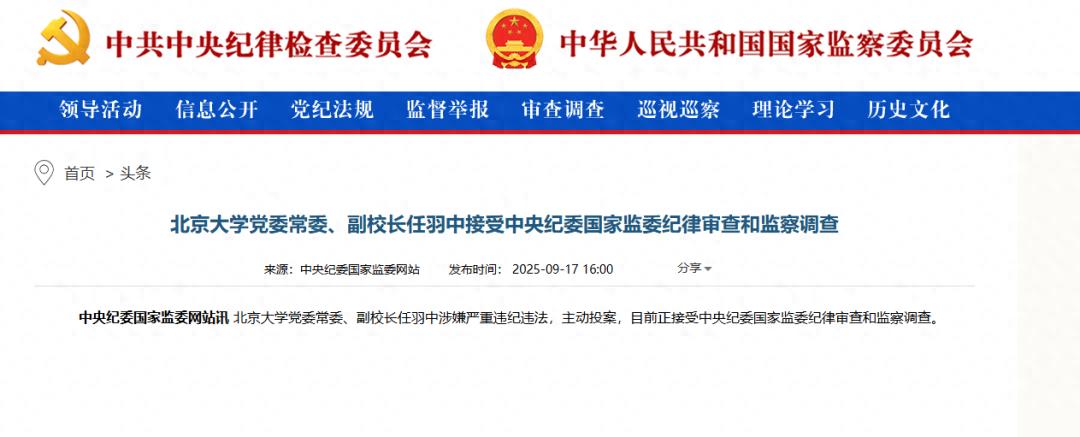 中央纪委国家监委网站9月17日消息,北京大学党委常委、副校长任羽中涉嫌严重违纪违法,主动投案,目前正接受中央纪委国家监委纪律审查和监察调查。