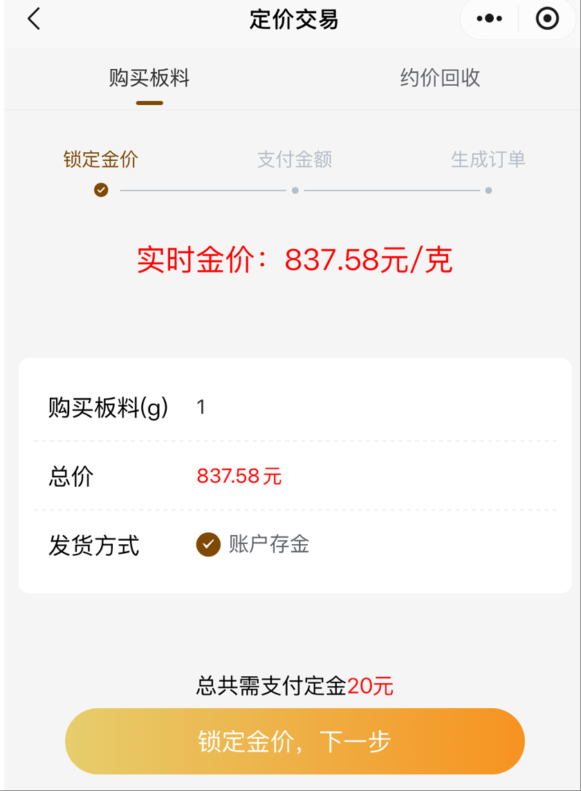 记者9月15日登陆该平台开放的某款寄卖小程序发现,该店铺也可提供定价交易,且针对公开客户。具体做法是,购买1克黄金板料,仅需要支付20元定金,即可下单“锁价”1克,交付方式默认为“账户存金”。根据该平台提供的合同,双方约定在下单后7日交收货物,如客户未按时结算,则需要支付迟延履行金。