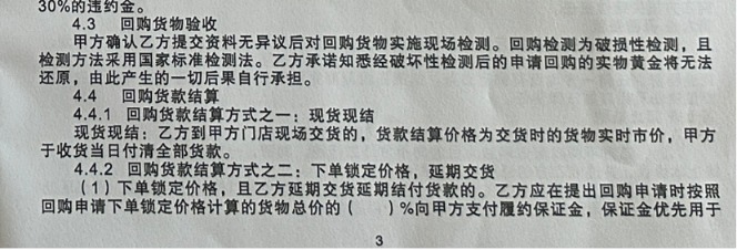 而在回购环节,也有类似操作模式。粤宝鑫的上游供应商,同样可以下单锁定价格,进行延期交货。乙方(即供应商)应在提出回购申请时,按照回购申请下单锁定价格计算的货物总价的一定比例,向粤宝鑫支付履约保证金。到约定期限,双方再进行交割。