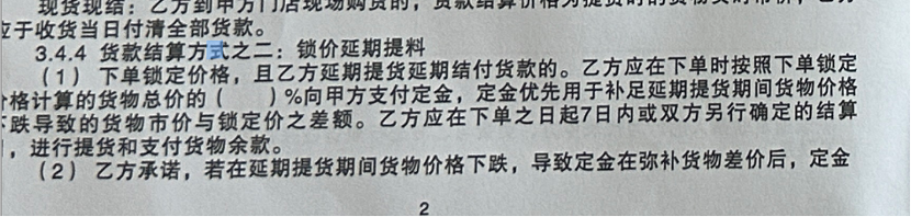一般而言,双方需在下单日起7日完成交易。如在延期提货期间货物价格下跌,定金在弥补货物差价后出现不足,乙方还需要补缴相应金额。到期,乙方按照结算约定价格支付尾款、提货。