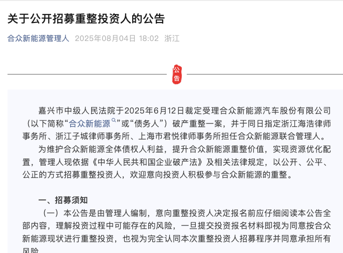 8月4日晚间,合众新能源管理人发布《关于公开招募重整投资人的公告》,对于招募意向投资人资格,从主体资格、行业背景、资金实力三方面提出了要求。