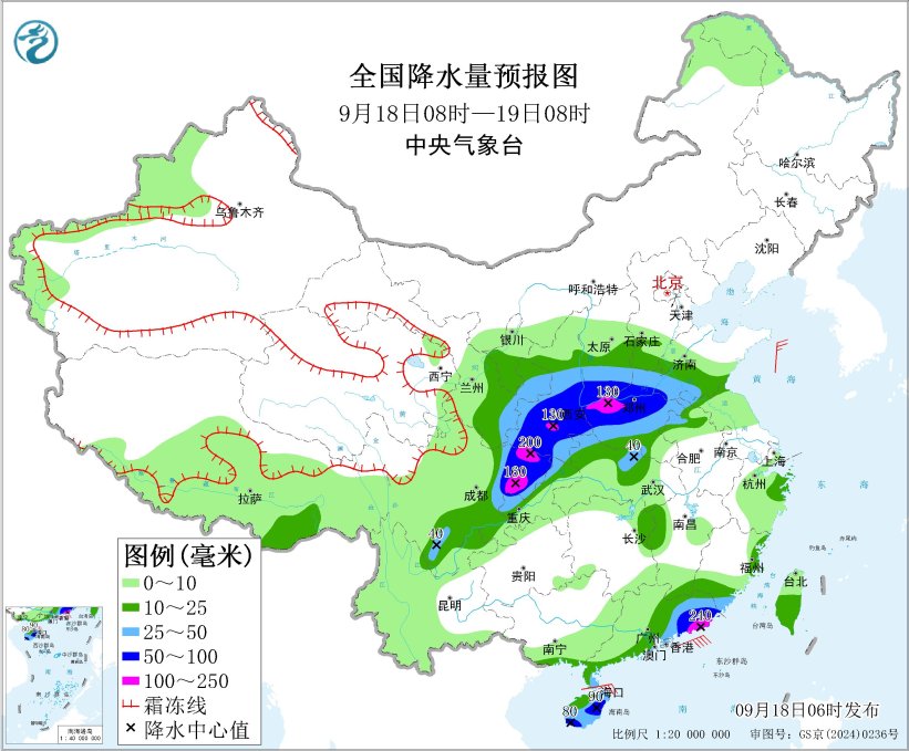 其中,9月18日08时至19日08时,甘肃东南部、陕西中南部、山西南部、四川盆地中东部、重庆西部、湖北北部、河南中北部、山东西南部、福建南部、广东东部和西南部沿海、海南岛等地部分地区有大到暴雨,其中,陕西南部、河南西部、四川盆地东部、广东东南部沿海等地部分地区有大暴雨(100~240毫米)。上述部分地区伴有短时强降水(最大小时降雨量20~50毫米,局地可超过70毫米),局地有雷暴大风等强对流天气。中央气象台9月18日06时继续发布暴雨黄色预警。