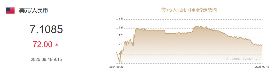 据中国外汇交易中心网站消息,中国人民银行授权中国外汇交易中心公布,2025年9月18日银行间外汇市场人民币汇率中间价为:1美元对人民币7.1085元,下调72个基点。