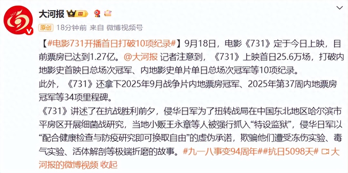 此外,据大河报,记者注意到,《731》上映首日25.6万场,打破内地影史首映日总场次冠军、内地影史单片单日总场次冠军等10项纪录。《731》还拿下2025年9月战争片内地票房冠军、2025年第37周内地票房冠军等34项里程碑。