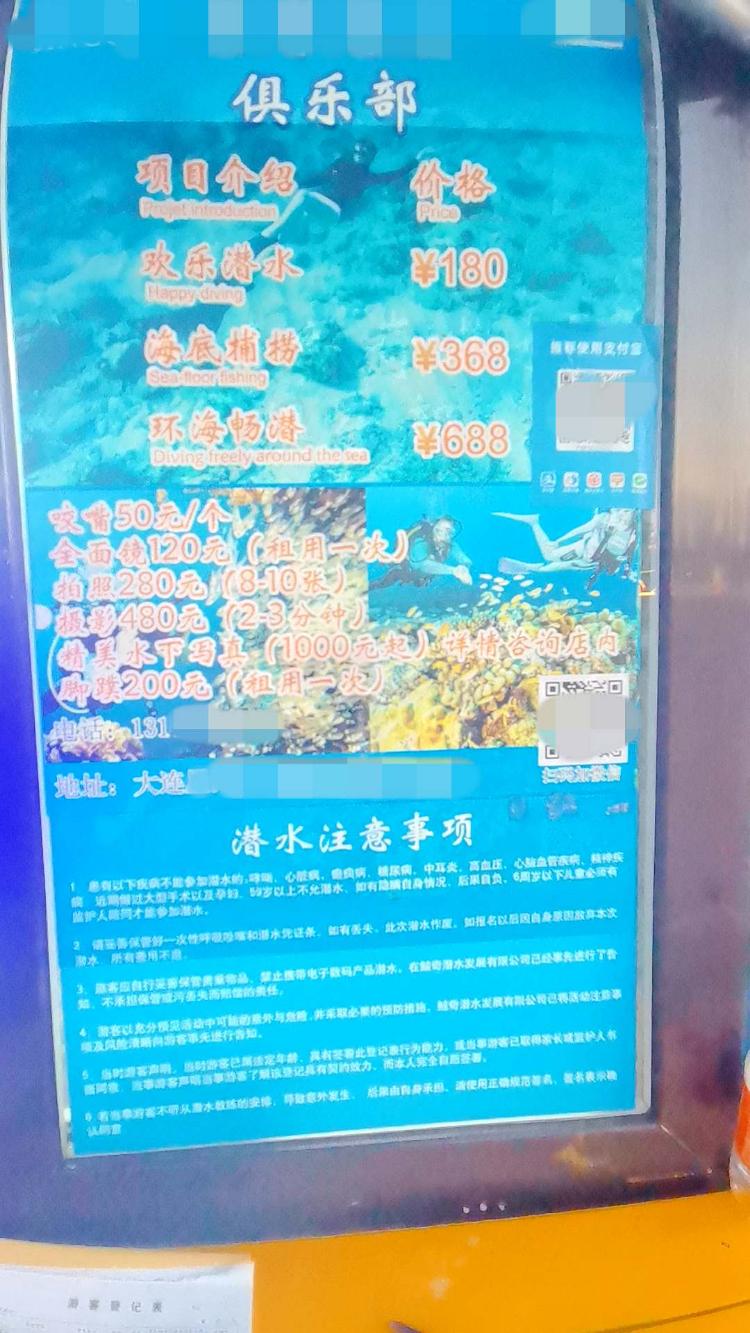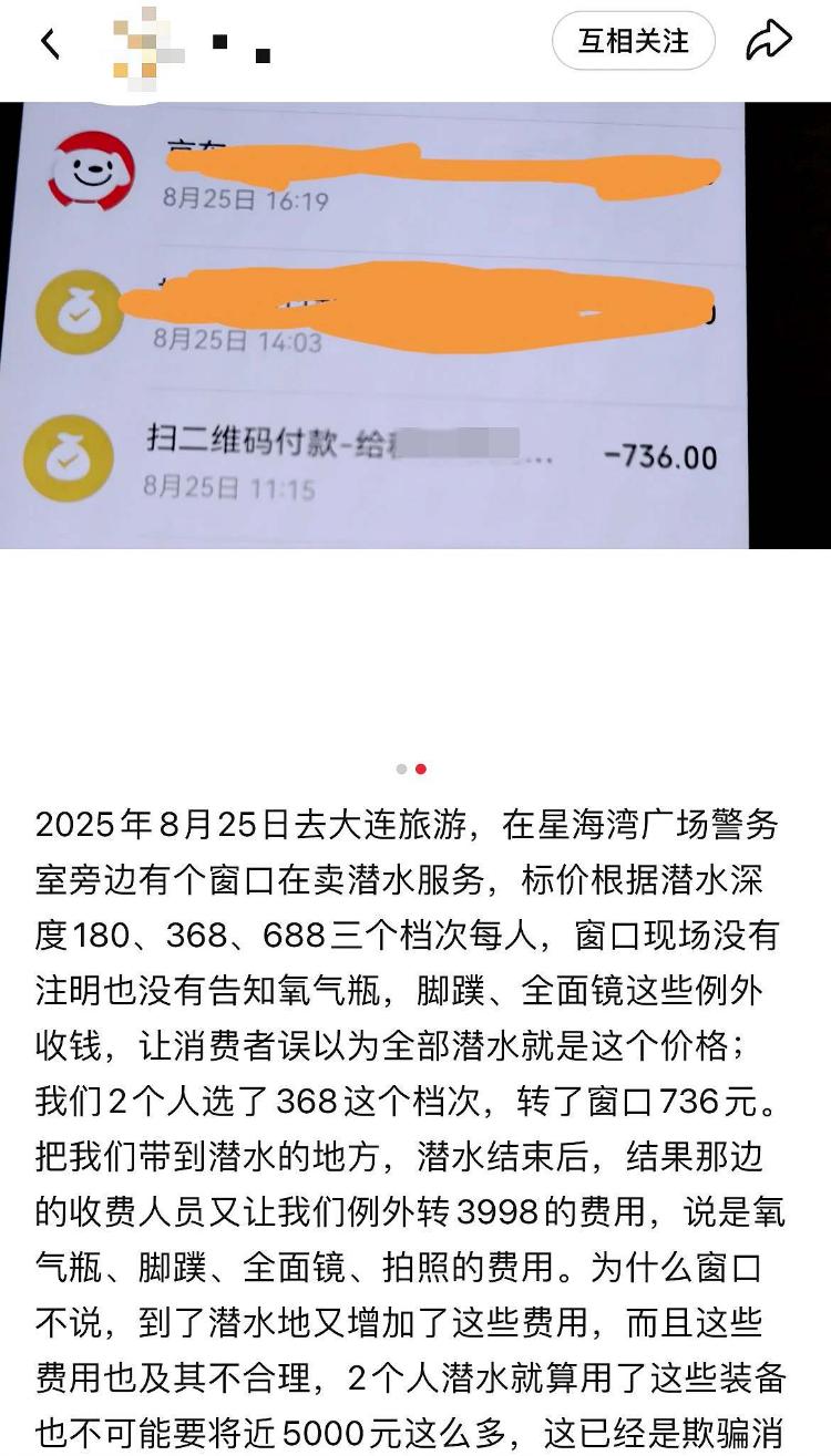 网帖显示,当事人柯女士称8月25日去大连旅游时,在星海湾警务室旁边的窗口购买了两个人每人368元的潜水服务。但潜水完毕后,商家要求需额外支付3998元,理由是这是使用氧气瓶、脚蹼、全面镜和拍照的费用。“费用极其不合理,两人潜水就算用了这些装备也不可能要将近5000元,这已经是欺骗消费者了。”柯女士质疑,为什么在一开始不提前告知?