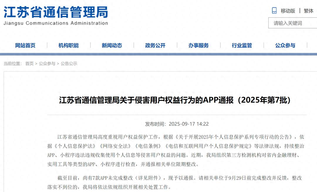 9月17日,江苏省通信管理局官网显示,江苏省通信管理局通报关于侵害用户权益行为的APP(2025年第7批)。