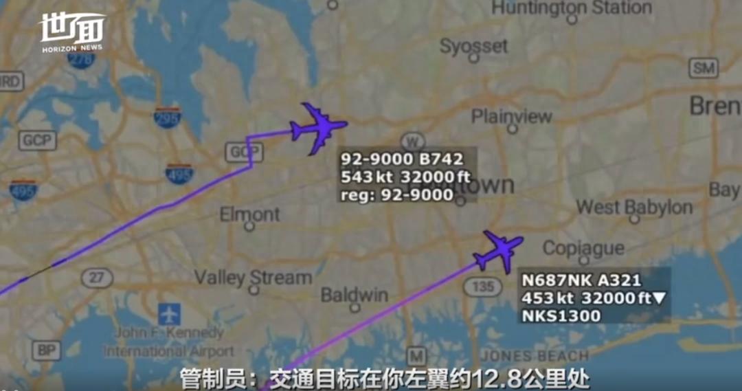 当空军一号与斯皮里特航空公司1300航班(一架从劳德代尔堡飞往波士顿的空客A321客机)飞越长岛上空时,空中交通管制员注意到两架飞机高度相近且航线趋于交汇。他试图提醒斯皮里特航空公司飞行员改变航向。