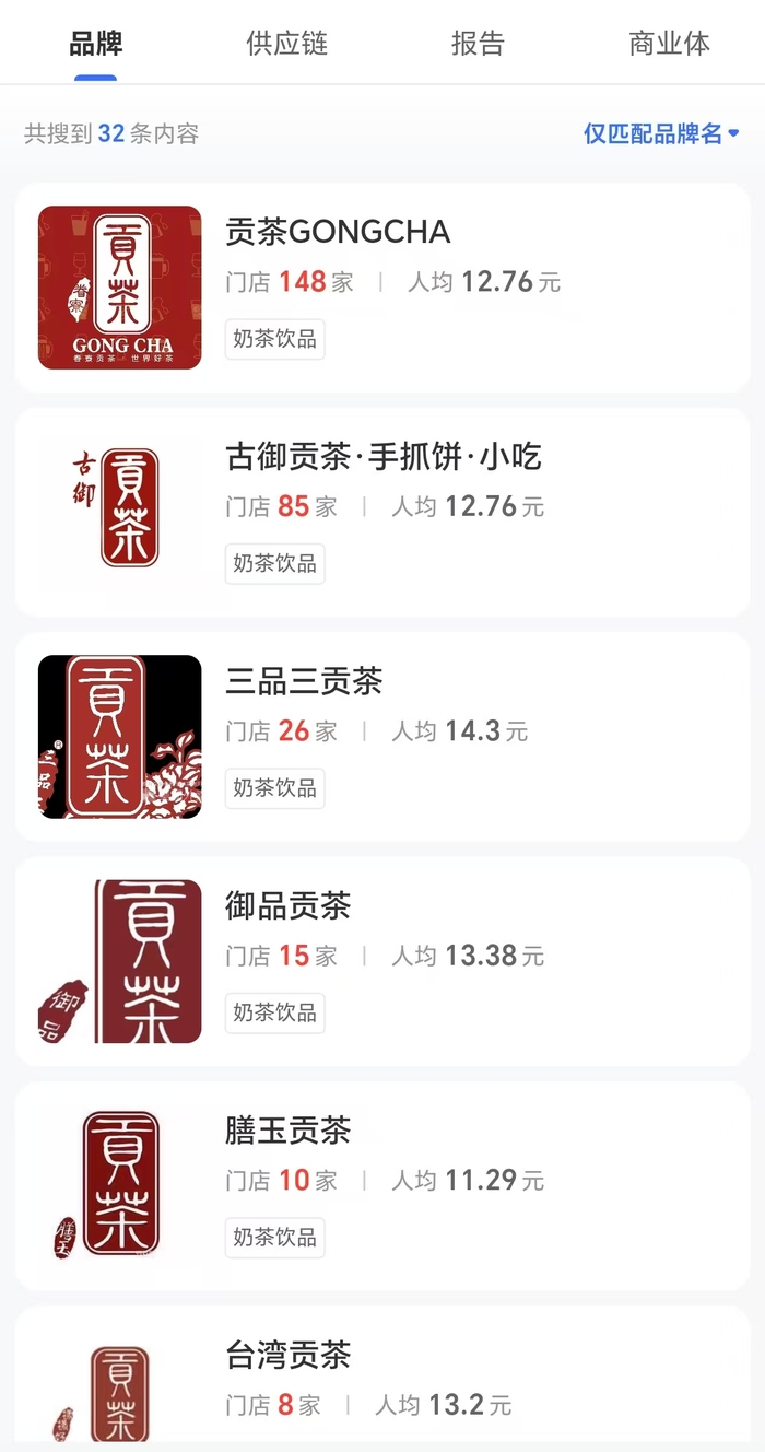 目前,市场上贡茶类奶茶饮品品牌较多,且标识相似度较高,很容易让消费者“傻傻分不清”。界面新闻查询窄门数据获悉,除了东方贡茶外,市场上还有古御贡茶、三品三贡茶、台湾贡茶等奶茶饮品品牌。