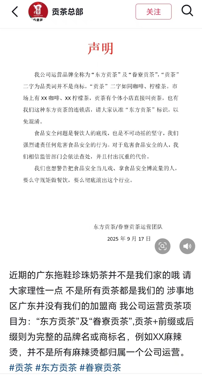 针对近日发生的“拖鞋放进珍珠奶茶”事件,东方贡茶作出回应。9月18日,东方贡茶在社交平台发布声明称,此次事件中的奶茶店“不是我们家的”,涉事地区广东没有其加盟店。