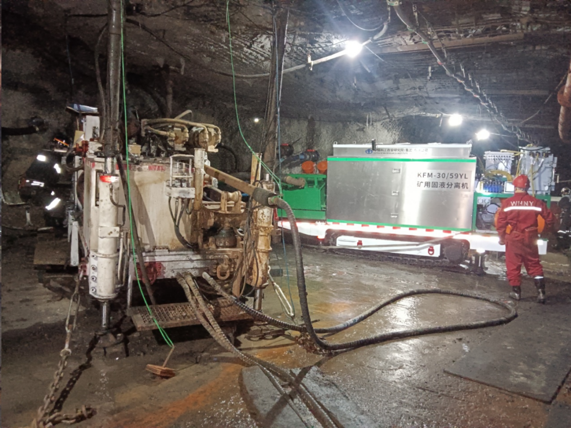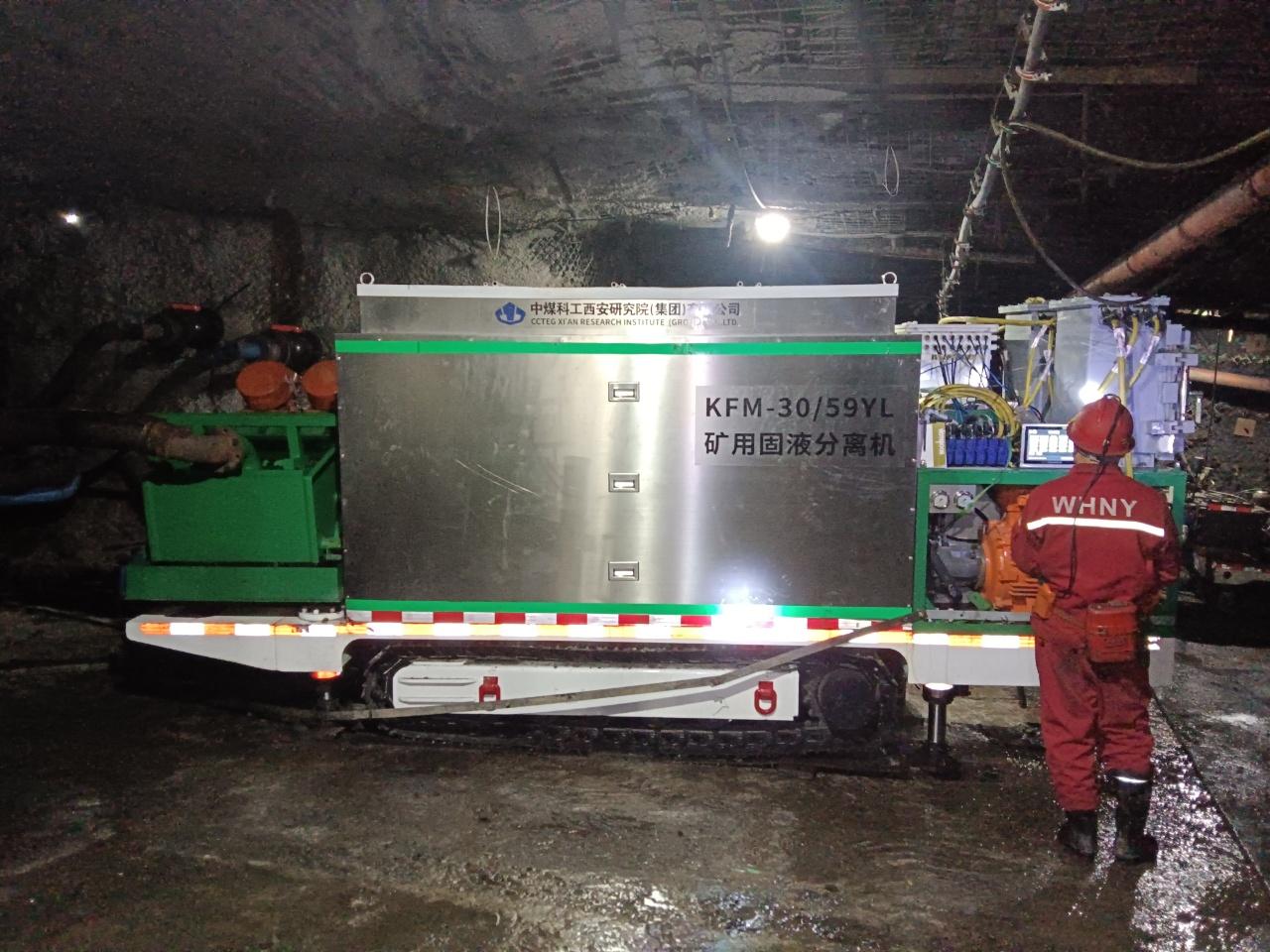 近日,中国煤科西安研究院(以下简称“西安研究院”)自主研发的矿用固液分离机在乌海能源五虎山煤矿顺利完成现场工业性试验。数据显示,该设备处理能力达30m3/h,清水回收率超80%,产水浊度仅为0.5NTU,成功将定向钻探孔口返出的携渣废水净化为可循环使用的清水,显著降低了钻探施工过程中的用水成本。该技术为解决煤矿井下定向钻探领域耗水量大、废水处理难等问题提供了创新且实用的方案。