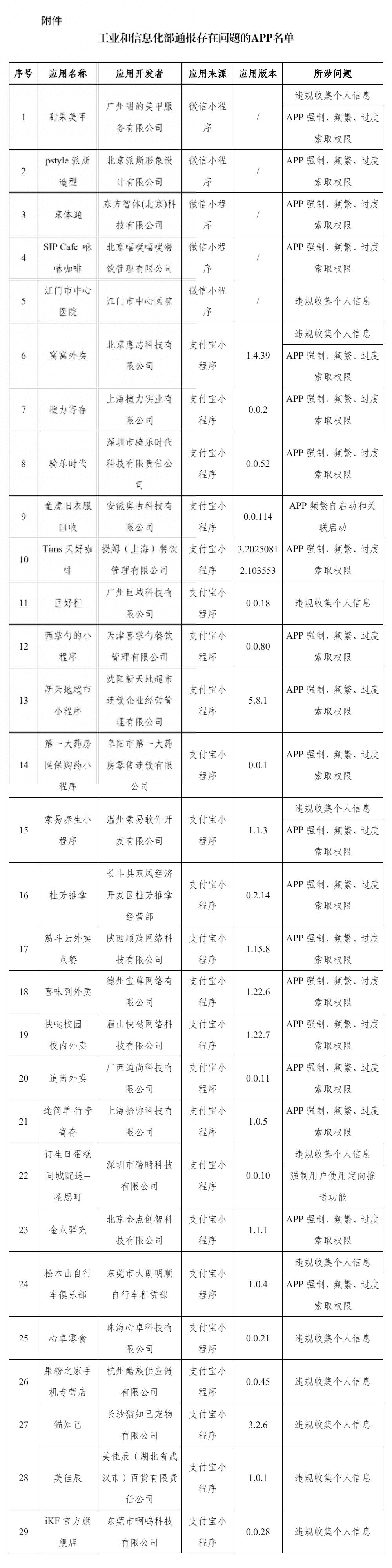 人民网北京9月18日电 (记者申佳平)据“工信微报”消息,根据中央网信办、工业和信息化部、公安部、市场监管总局等四部门联合发布的《关于开展2025年个人信息保护系列专项行动的公告》,依据《个人信息保护法》《网络安全法》《电信条例》《电信和互联网用户个人信息保护规定》等法律法规,工业和信息化部对APP违法违规收集使用个人信息等问题开展治理。近期,经组织第三方检测机构进行抽查,共发现29款APP存在侵害用户权益行为。