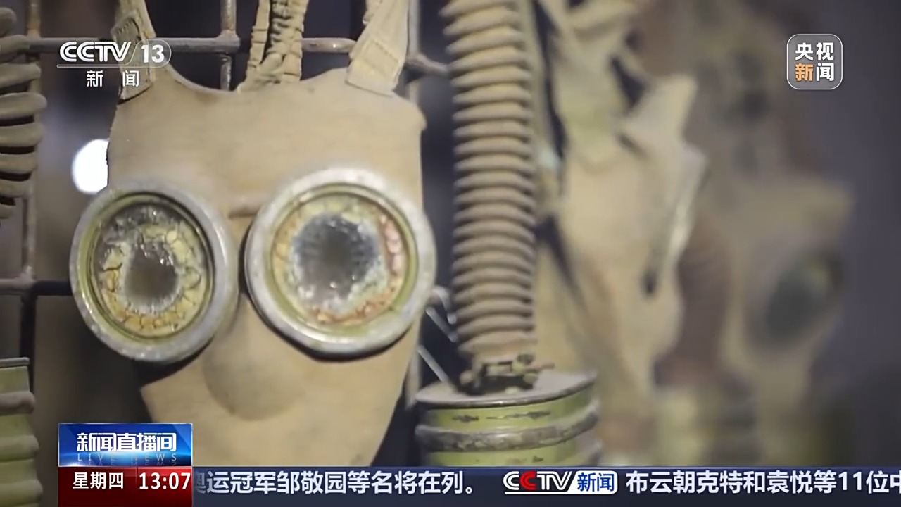 侵华日军第七三一部队罪证陈列馆副馆长 张阳:这些防毒面具就是从哈尔滨市平房区征集而来,它是人面造型,然后在鼻子处有软管,下面是空气过滤器。他们进行实验的时候,七三一部队队员为了不被感染都要使用这样的防毒面具。