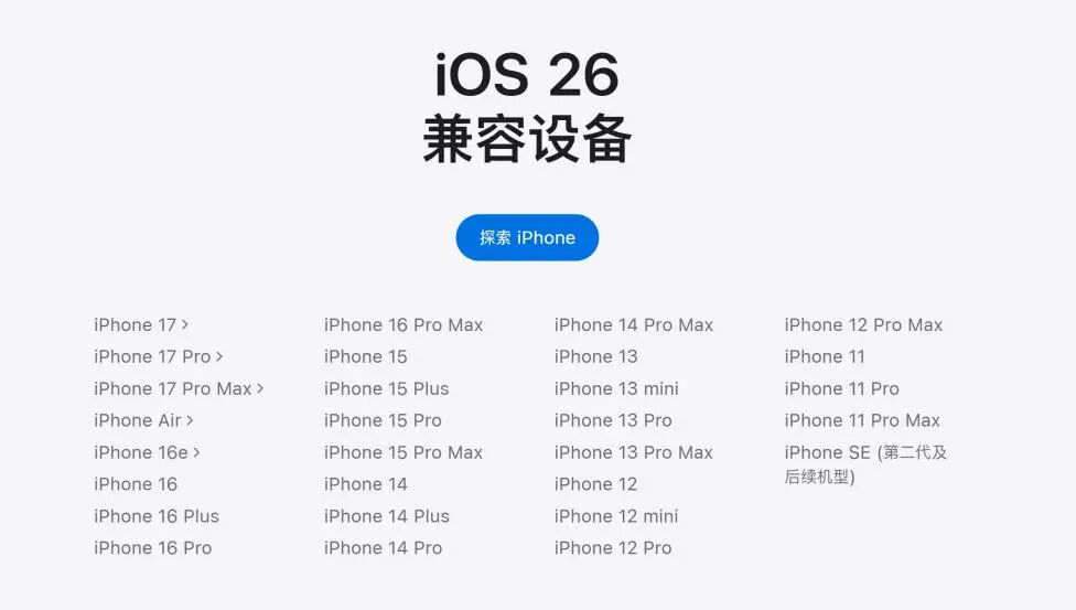 据苹果官网,iOS 26兼容的机型包括iPhone 11系列、iPhone SE(第二代及后续机型)以及iPhone 12至iPhone 17系列的型号。