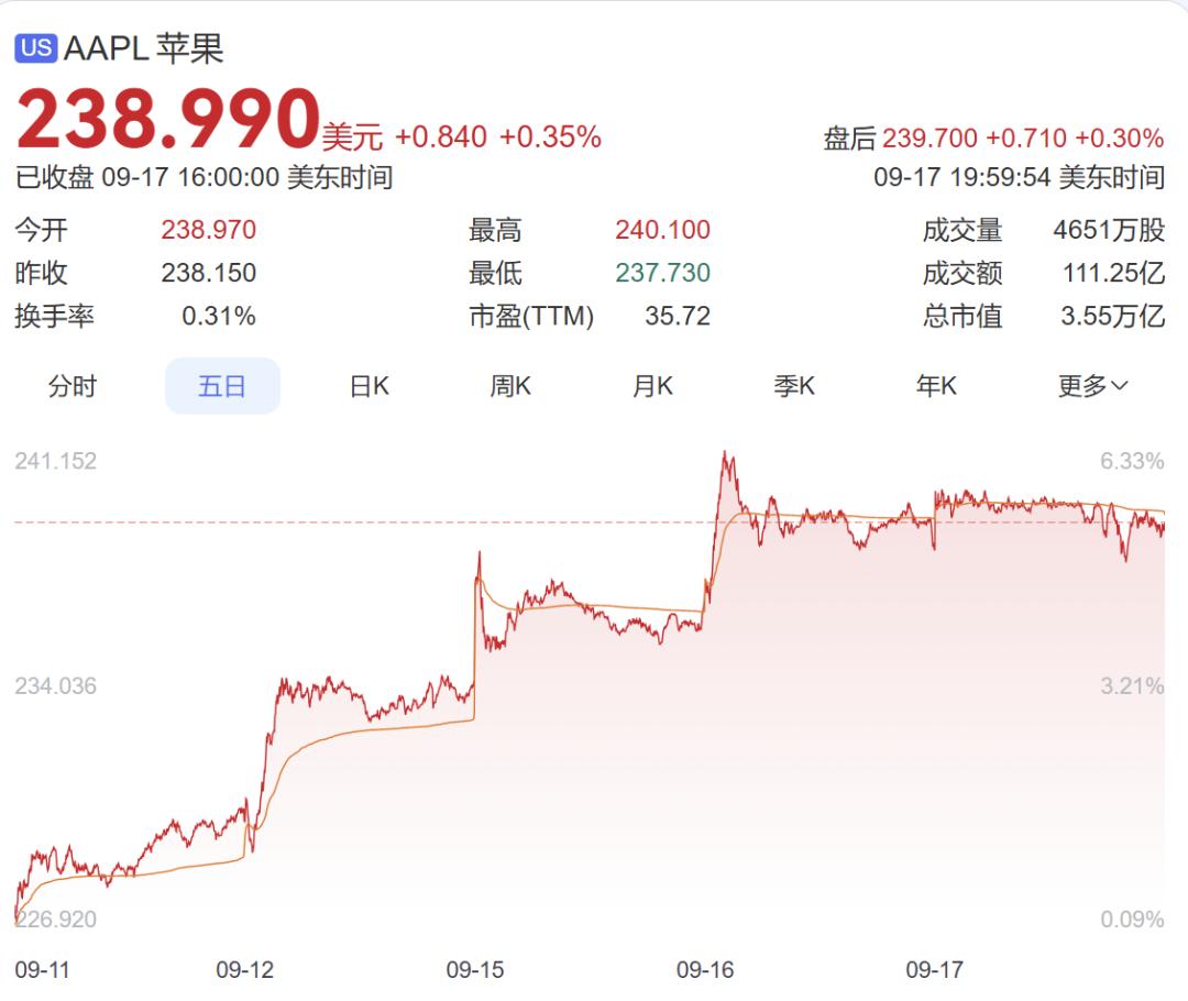 自9月11日以来,苹果股价已连续5个交易日上涨,总市值增加超1800亿美元(约合人民币1.28万亿元)。