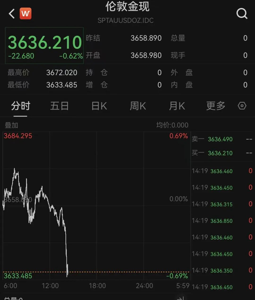 截至发稿,现货黄金跌约0.5%,跌破3640美元,而COMEX黄金跌幅较大,跌约1%。