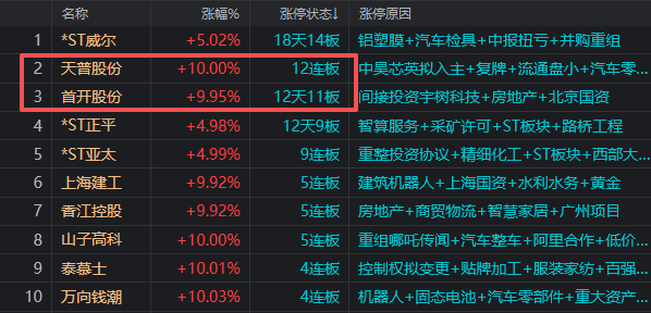 一方面,截至今天收盘,首开股份走出了12天11板,刚刚复牌的天普股份也录得第12个一字板。即便指数巨震,两只个股仍然守住了涨停。