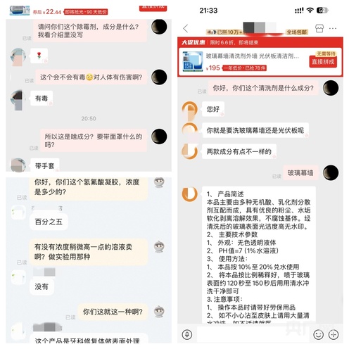 记者以消费者身份咨询多个售卖玻璃幕墙清洗剂的商家客服商品成分时,其并未正面予以回应。其中一个客服,复制了一段笼统的产品简述作为回应:“本品主要由多种无机酸、乳化剂分散剂互配而成”。售卖牙科用氢氟酸酸蚀剂的商铺客服则介绍,店铺并无高浓度的氢氟酸溶液售卖,且其售卖的商品仅用于牙科修复体表面处理用。