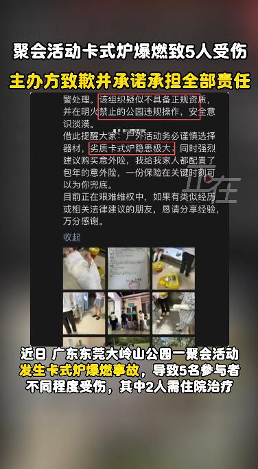 据正观新闻,近日,广东东莞大岭山公园一聚会活动发生卡式炉爆燃事故,导致5名参与者不同程度受伤,其中2人需住院治疗。