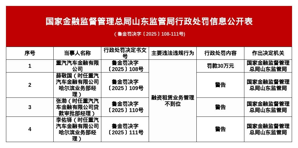 近日,国家金融监督管理总局山东监管分局发布了罚单,剑指重汽汽车金融有限公司及其相关责任人。