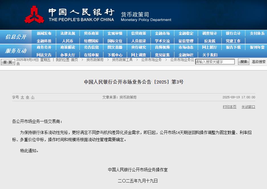9月19日,中国人民银行发布公开市场业务公告[2025]第3号称,为保持银行体系流动性充裕,更好满足不同参与机构差异化资金需求,即日起,公开市场14天期逆回购操作调整为固定数量、利率招标、多重价位中标,操作时间和规模将根据流动性管理需要确定。