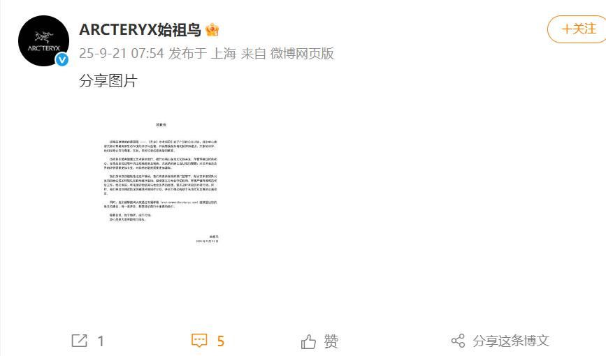 9月21日,@ARCTERYX始祖鸟 发文道歉: