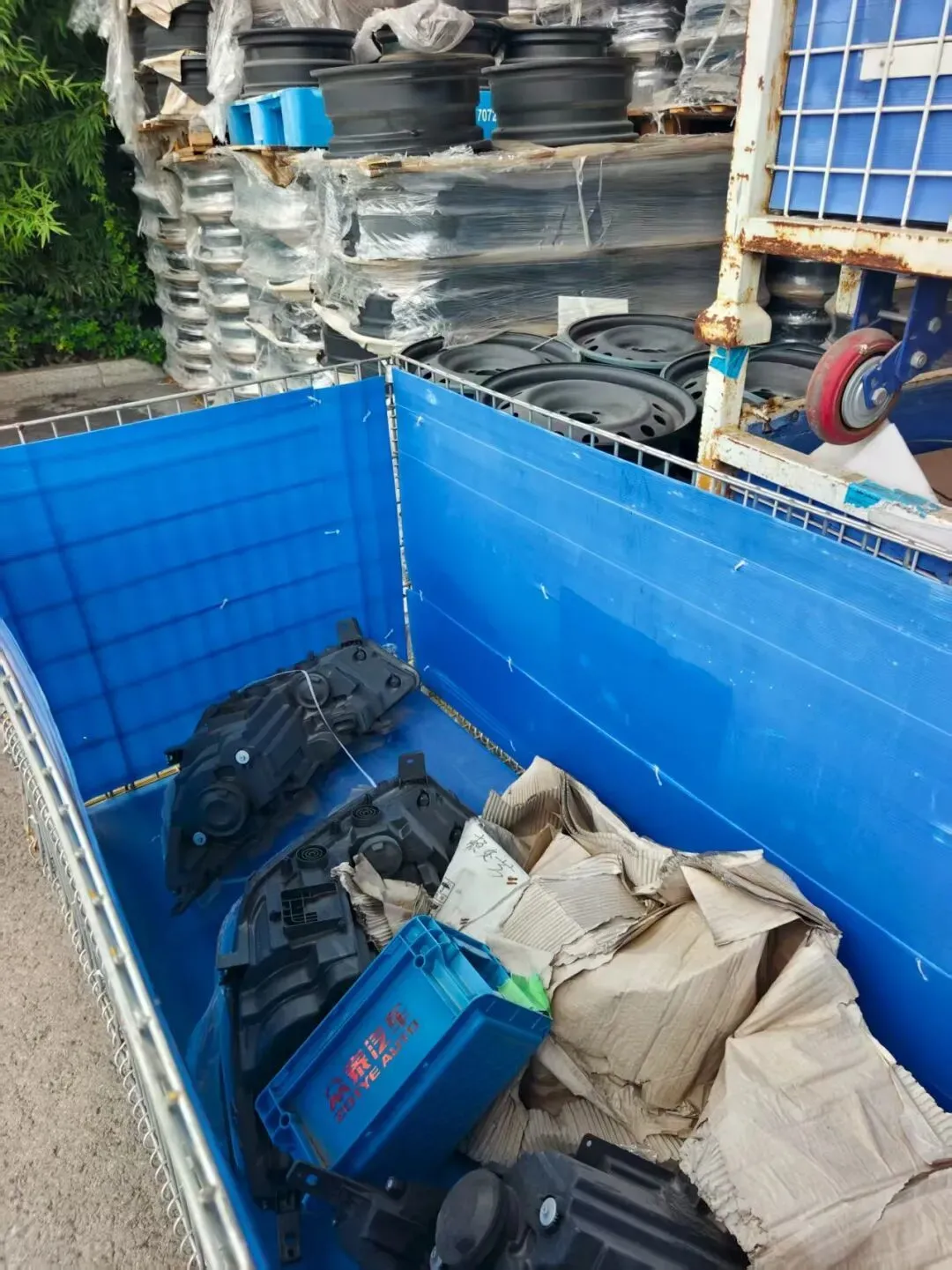 一块空地上,有些“板料托盘”上面盖着的防雨布已经破烂,但裸露在外的“后地板右纵梁”看起来非常新。另一块空地上,还没有来得及被安装的方向盘、座椅等物料被毫无遮拦地高高堆起。其中一堆一米多高的物料垛,则是包装整齐的“安全带预拉伸装置”,供货商是浙江松原汽车安全系统股份有限公司。由于在外风吹雨淋,这些纸箱已经被泡软了有些坍塌。另一垛“飞轮与齿圈组件”被放在一个木框里,木框的边缘已经有些开裂。