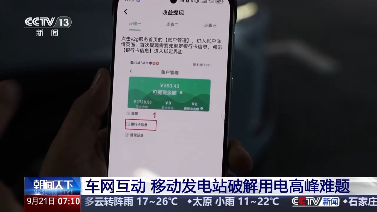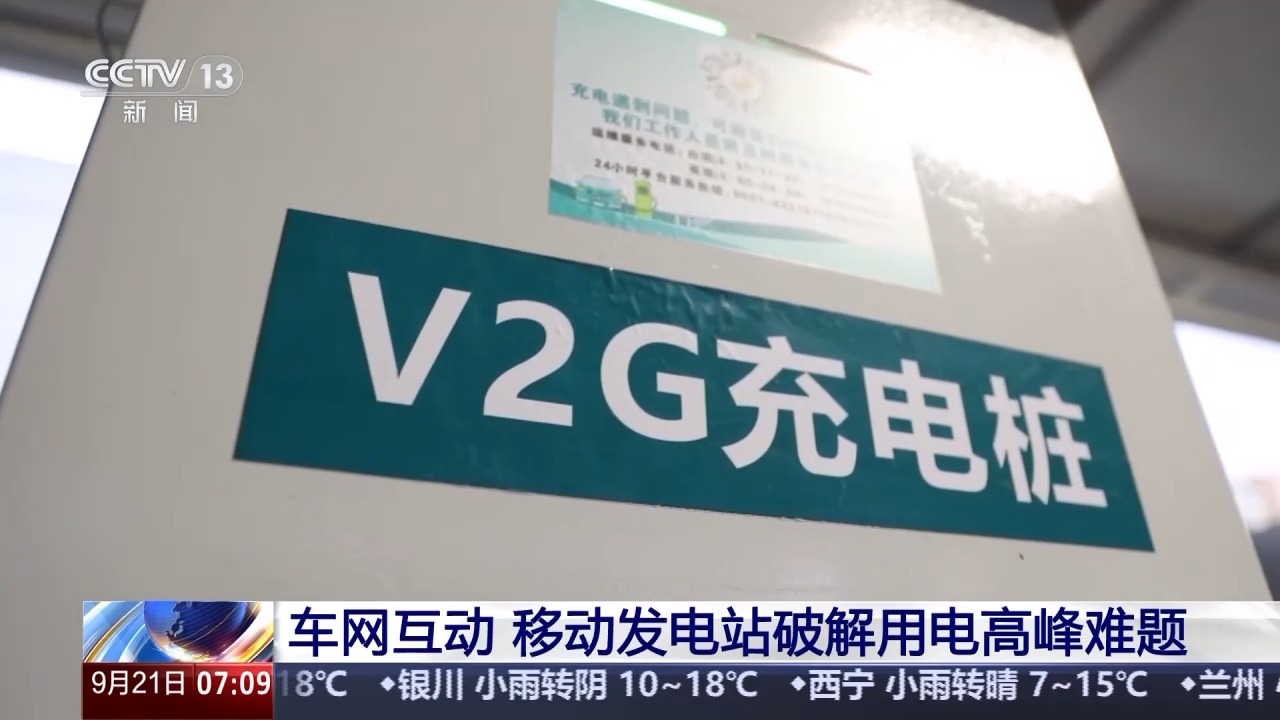 总台央视记者古峻岭:我来到了一个与众不同的充电站,说它与众不同是因为这个电站不只是可以充电,同时还是一个小型的发电站。这个车的充电口上虽然插着充电枪,但此刻电能却并没有进到车里,反而是把车里电池的电源源不断地抽出来,然后通过充电桩送到电网上,满足用电高峰时的用电需求。