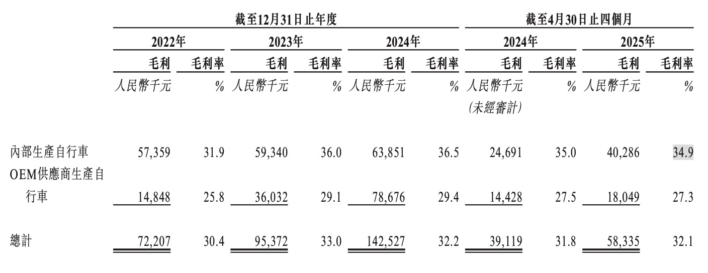 与此同时,公司代工生产比例持续上升。招股书显示,2022年、2023年及2024年及2025年前四个月,大行科工由OEM供应商生产的自行车分别有4.4万辆、7.65万辆、13.67万辆及6.6万辆,分别占总数约29.5%、45.1%、56.8%及65.5%。也就是说,今年前四个月,大行科工有超过6成产品来自代工生产。