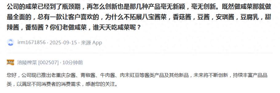 “你们老做咸菜,谁天天吃咸菜呢?”9月15日,就咸菜产品销量承压问题,一名投资者在互动平台向涪陵榨菜(002507)发出吐槽,公司的咸菜已经到了瓶颈期,再怎么创新也是那几种产品毫无创新,为什么不拓展八宝酱菜、香菇酱、豆酱等产品。