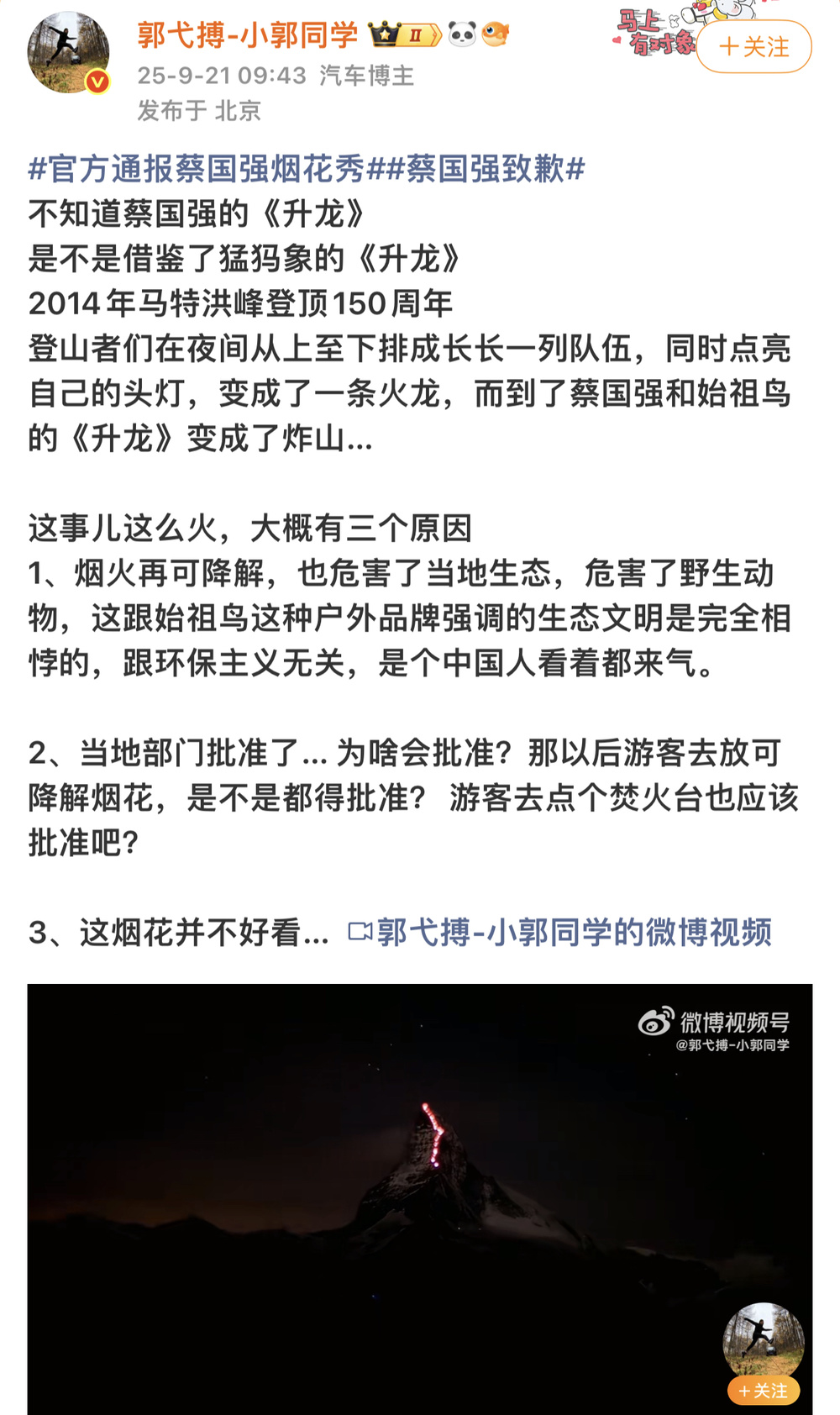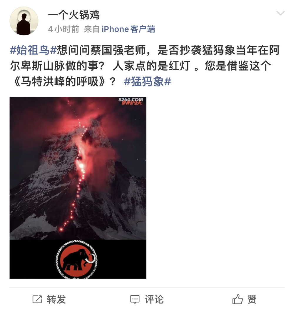 9月19日,户外品牌始祖鸟联手艺术家蔡国强在喜马拉雅山脉放烟火。即便主办方给出了一则说明,称“污染物排放符合环保标准”“确保不留生态隐患”,但是在喜马拉雅山脉燃放烟花的行为仍引起巨大争议,烟花大师蔡国强和始祖鸟陷入舆论旋涡。有网友质疑,该创意抄袭自2015年户外品牌猛犸象MAMMUT为致敬150年前人类首攀马特洪峰而在阿尔卑斯山脊使用无污染头灯点亮的“灯光火龙”。
