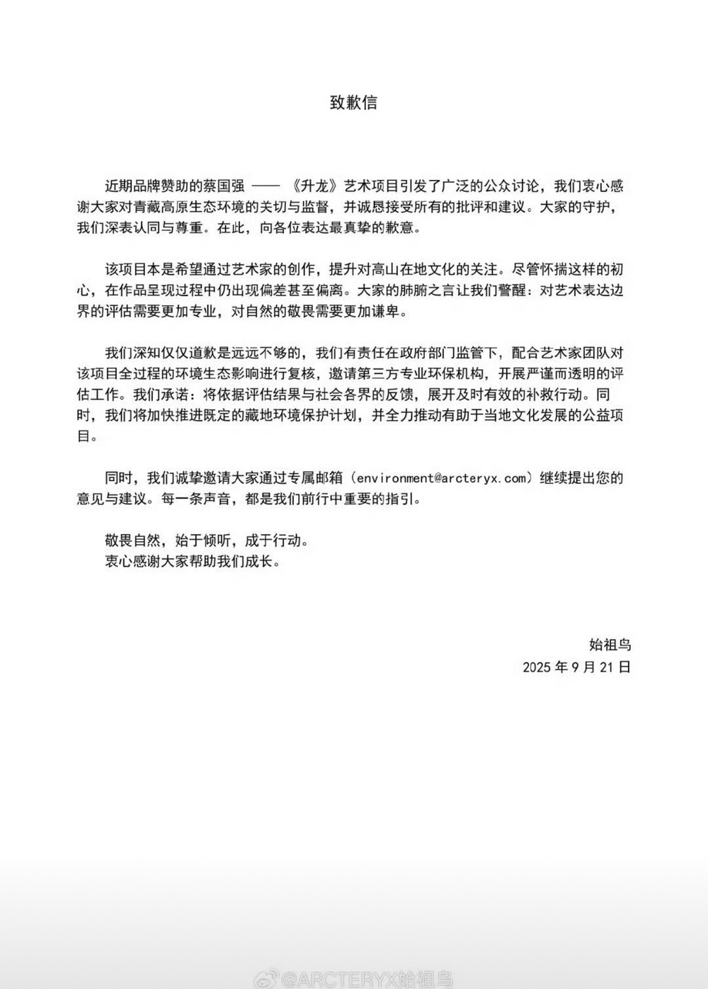 21日,始祖鸟回应:“在作品呈现过程中出现偏差甚至偏离。在此,向各位表达最真挚的歉意。将依据评估结果与社会各界的反馈,展开及时有效的补救行动。”蔡国强回应称:“我们确实存在很多考虑不周之处,我深表歉意。接下来,我们将主动配合第三方机构及相关部门,就此事对自然生态造成的影响进行多方面的评估,并将以实际行动保护青藏高原生态环境。”目前,日喀则市委、市政府已成立调查组第一时间赶赴现场核查,后续将根据核查结果依法依规处理。