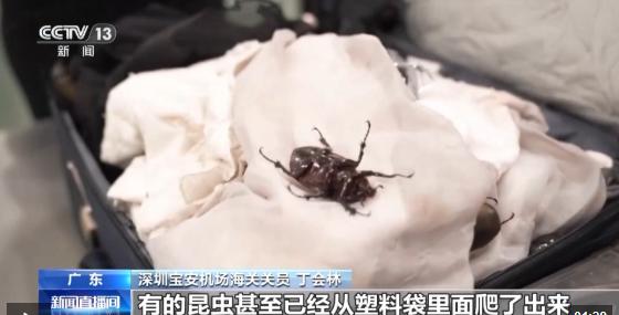 “行李箱里面盖了一层衣服,掀开以后,发现大量塑料袋,每个塑料袋里面都装有一只活体昆虫,有的昆虫甚至已经从塑料袋里爬了出来。”深圳宝安机场海关关员丁会林介绍,查获的活体昆虫中有活蜘蛛、活螳螂、昆虫卵、活甲虫等,其中,高卡萨斯南洋大兜虫、史蒂芬斯鬼艳锹甲、巨颚叉角锹甲等5个品种共66只活体昆虫在我国无自然分布,属于外来物种。