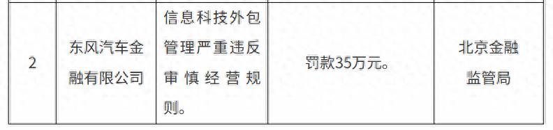 9月19日,国家金融监督管理总局北京监管局官网披露的行政处罚信息公开表显示,因信息科技外包管理严重违反审慎经营规则,东风汽车金融有限公司(以下简称“东风汽车金融”)被罚35万元。