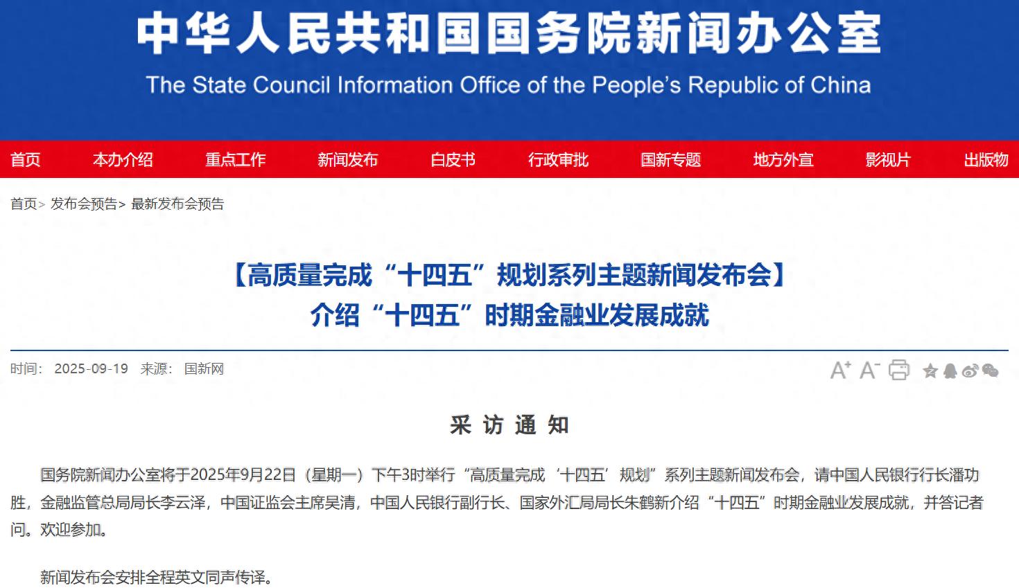 据国务院新闻办公室网站消息,国务院新闻办公室将于9月22日下午3时举行“高质量完成‘十四五’规划”系列主题新闻发布会,请中国人民银行行长潘功胜,金融监管总局局长李云泽,中国证监会主席吴清,中国人民银行副行长、国家外汇局局长朱鹤新介绍“十四五”时期金融业发展成就,并答记者问。