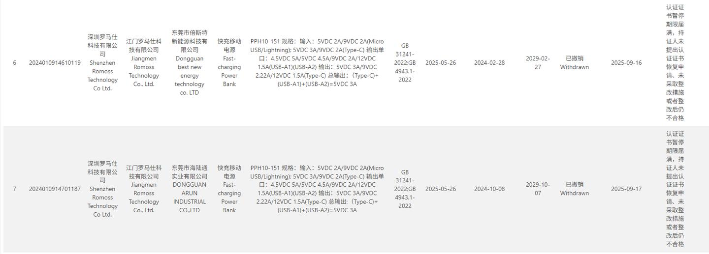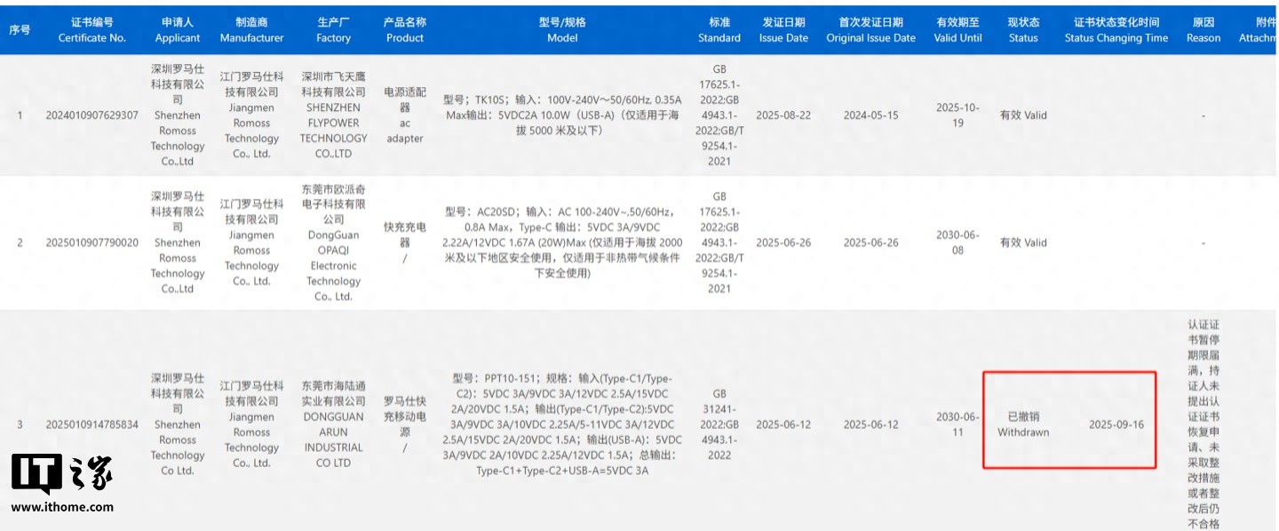 IT之家查询中国质量认证中心官网获悉,9 月 16 日和 17 日,深圳罗马仕科技有限公司的多个快充移动电源类产品 3C 认证证书被撤销,原因是“认证证书暂停期限届满,持证人未提出认证证书恢复申请、未采取整改措施或者整改后仍不合格”。